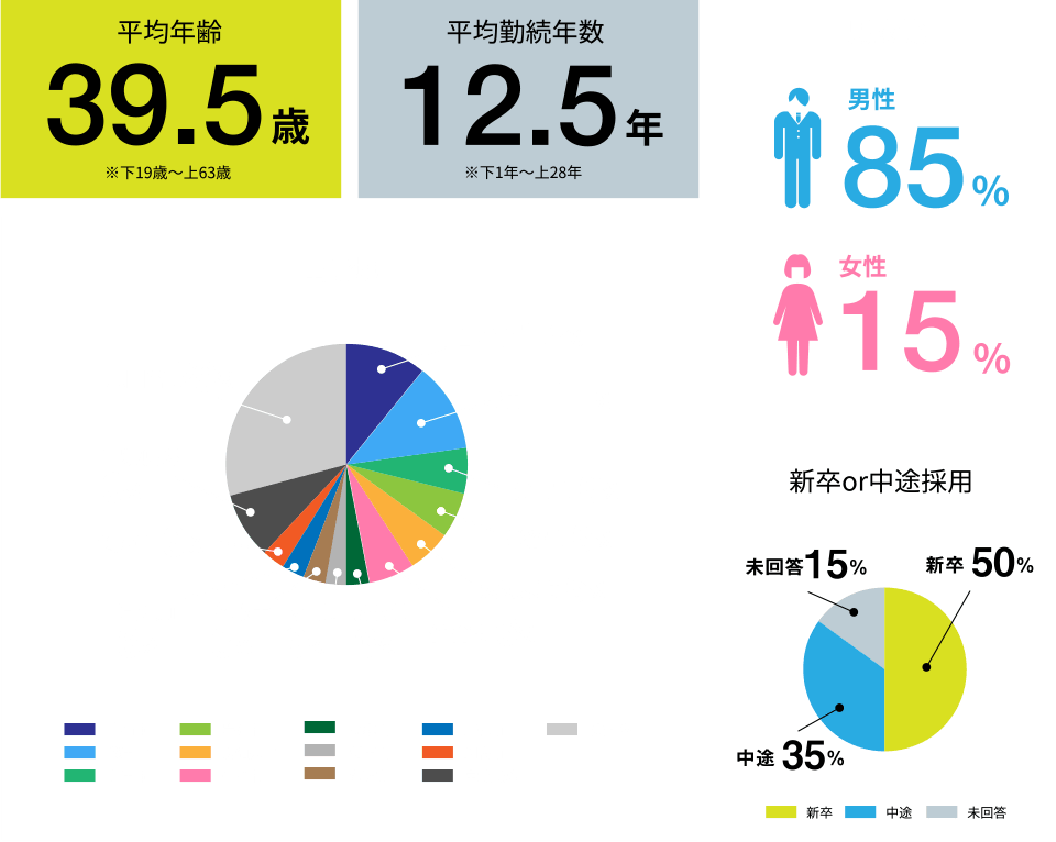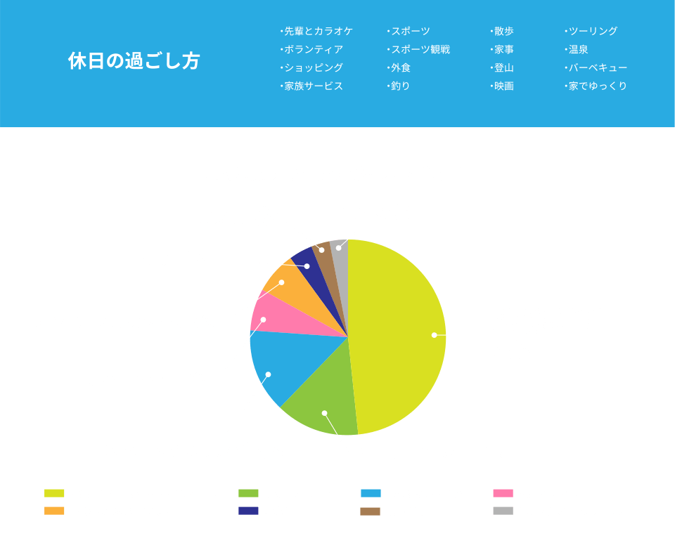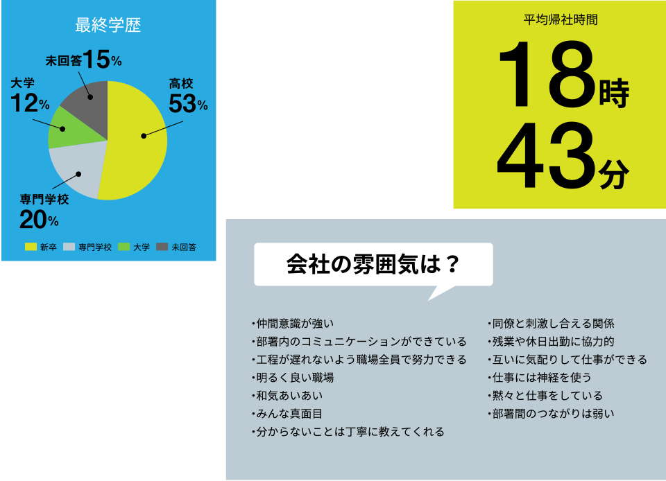 当社の社員は、働きやすい職場環境の中で仕事に前向きに取り組みながら、休日は余暇や趣味を満喫するなど、ONとOFFのメリハリをつけて毎日の生活を楽しんでいます。そんないきいきと人生を謳歌する社員のほぼ全員にアンケートをとり、社員たちのリアルな日常を分かりやすく数字やデータで表現してみました。